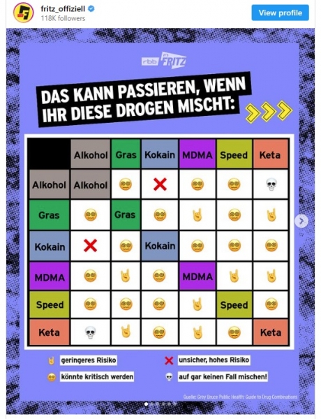 Radio Fritz« (rbb) svoji mladi ciljni skupini na Instagramu razlaga, katera zdravila je treba mešati, da bo tveganje »manjše« – in katerih je morda bolje ne mešati.
