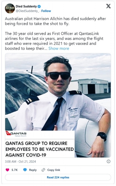 Mladi avstralski pilot, prisiljen sprejeti mRNA, da bi obdržal službo pri Qantasu, umre "nenadoma in nepričakovano"“.