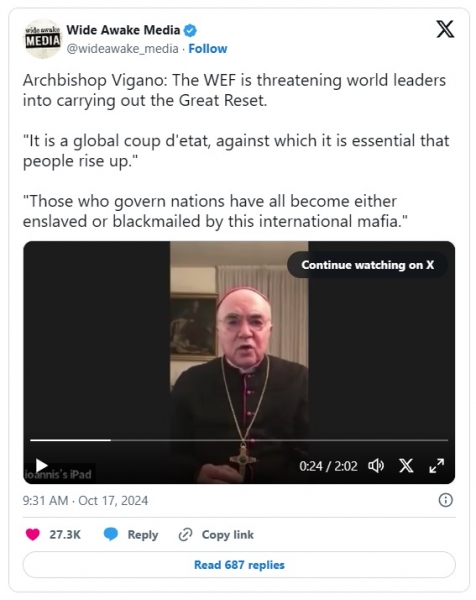 "To daleč presega pandemijo," je nadalj Vigano. "Gre za svetovni državni udar." Zelo pomembno je, da se ljudje branijo pred tem in da se sproži mednarodni pravni postopek.