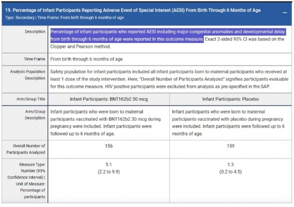 Pfizerjevo nedavno posodobljeno klinično preskušanje, »Ocena varnosti, prenašanja in imunogenosti BNT162b2 proti COVID-19 pri zdravih nosečnicah« (ClinicalTrials.gov ID NCT04754594), je spodbudilo ponovni pregled pri dojenčkih, potem ko so v študiji cepljenih odkrili pomembne prirojene nepravilnosti. udeležencev.