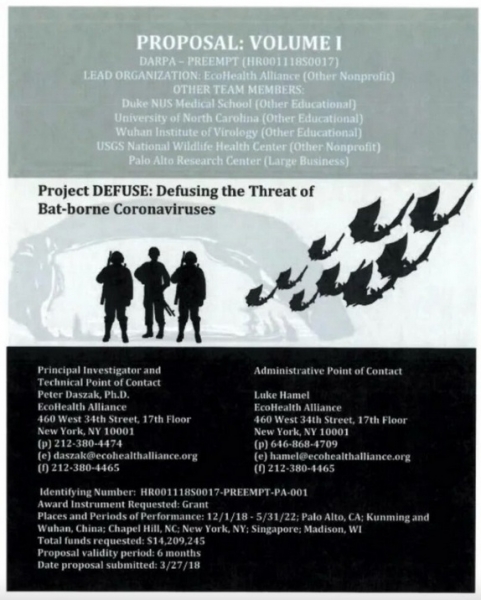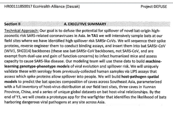 Dokument s kodnim imenom DEFUSE je Faucijevo združenje EcoHealth Alliance predložilo DARPA (Agencija za napredne obrambne raziskovalne projekte).