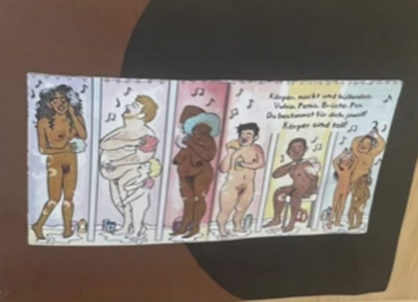 Zdi se, da ena plošča plakata prikazuje debelega moškega pod prho z majhnim dečkom, medtem ko druga prikazuje transidentificiranega moškega z razgaljenim penisom in prsmi. Zadnja plošča plakata prikazuje dva gola otroka, ki se tuširata z odraslim.