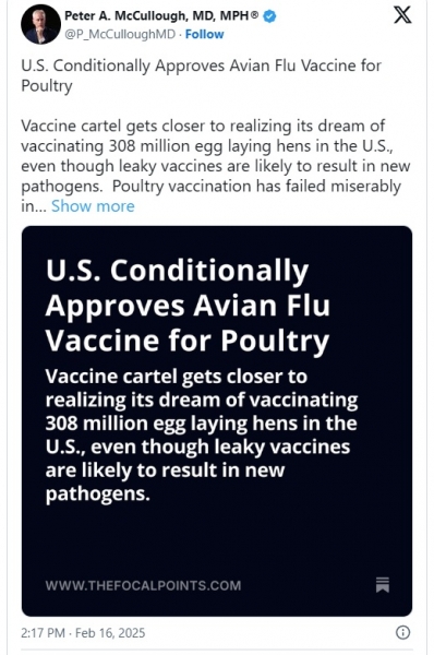 ZDA so pogojno odobrile cepivo proti ptičji gripi za perutnino, kartel za cepljenje pa se približuje svojim sanjam o cepljenju 308 milijonov kokoši nesnic v ZDA, čeprav bodo uhajajoča cepiva verjetno povzročila nove patogene. Na Kitajskem in v jugovzhodni Aziji je bilo cepljenje perutnine žalostno neuspešno že desetletja, saj povečuje število ptic, okuženih s H5N1, in ustvarja odporne seve. Zdaj je Amerika na robu, da naredi isto javnozdravstveno napako.