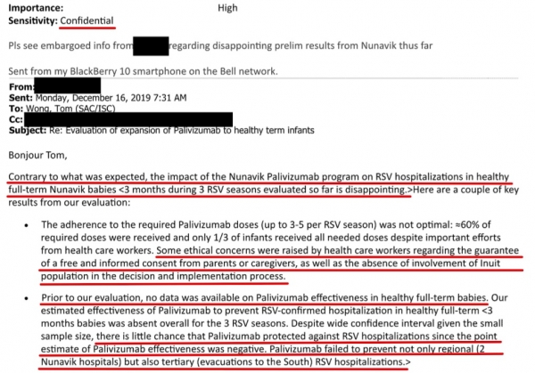 Toda vlada je program nadalja, namesto da bi ga ustavila. Starši so bili v temi, prav tako inuitski voditelji in širša skupnost. Še huje, poskus je že spodletel – injekcije cepiva proti RSV* palivizumabu niso delovale po načrtih.