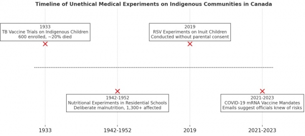 Od eksperimentov s šolsko prehrano v letih 1940-50, kjer so raziskovalci namenoma stradali domorodne otroke, da bi preučili podhranjenost, do preskušanja cepiva proti tuberkulozi na 600 domorodnih otrocih v Saskatchewanu, kjer jih je umrlo skoraj 20 %, je zgodovina dokazala, da so uradniki dokazali, da so pripravljeni žrtvovati domorodno prebivalstvo zaradi »znanosti«.