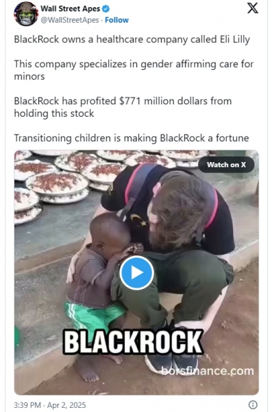 Objave navadnih ljudi na X razkrivajo resnico: »Otroci v tranziciji obogatijo BlackRock« in da je bogastvo zgrajeno na hrbtih otrok, ki se bodo do konca življenja soočali z obžalovanjem, neplodnostjo in odvisnostjo od zdravil.