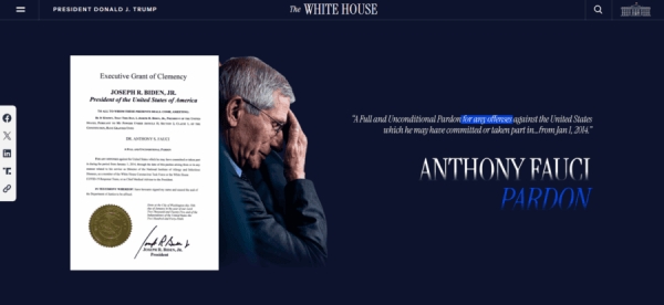 Sporočilo Bele hiše je prišlo potem, ko je nekdanji predsednik Joe Biden tik pred odhodom s položaja preventivno pomilostil dr. Anthonyja Faucija, ki zajema obdobje od leta 2014 do konca njegove kariere. Ta kontroverzna odločitev preprečuje kakršno koli pravno odgovornost Faucija v zvezi z izvorom virusa ali vlogo ZDA v tujih raziskavah.
