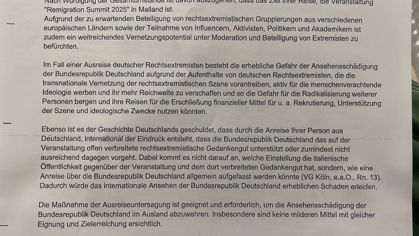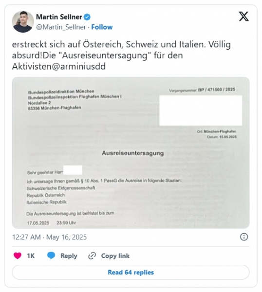 Dejstvo, da nemška država svojim državljanom preprečuje odhod iz države, je zaskrbljujoče. Še posebej, če pomislimo, da ne zato, ker bi kršili kakšne zakone, ampak zato, ker bi na konferenci lahko izrazili mnenje, ki je politično nezaželeno. Ena od prizadetih oseb – na X znana kot »Arminius« – na vprašanje pojasni: