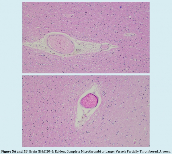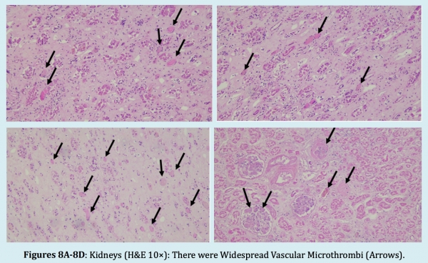 Masivni mikrotrombi v ledvicah (označeni s puščicami) – Vir: Guerriero et al. 2025. Na splošno ugotovitve močno kažejo na s cepljenjem povzročeno trombotično trombocitopenijo (VITT): Simptomi so se pojavili kmalu po cepljenju, moški pa je imel trombozo po vsem telesu in nizko število trombocitov. D-dimeri so bili znatno povišani. Za potrditev diagnoze bi bil potreben test protiteles proti PF4, vendar to ni bilo mogoče.