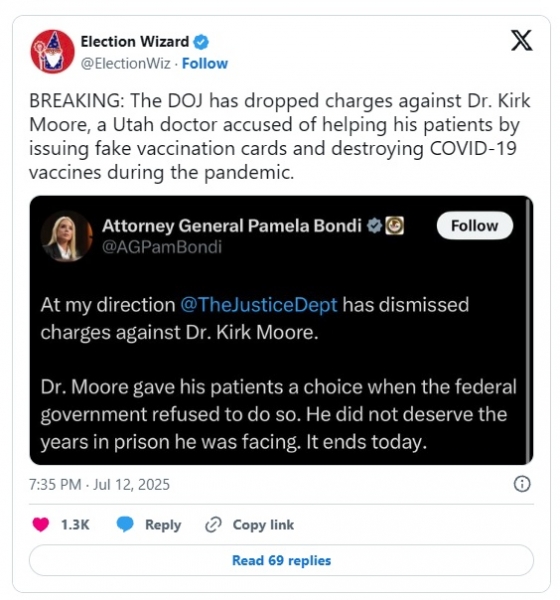 Po tedenskem sojenju na sodišču v Salt Lake Cityju so bile obtožbe proti zdravniku iz Utaha Kirku Mooru, ki je bil obtožen prevare s ponarejenimi potrdili o COVID-19 med "pandemijo", zavrnjene z odredbo ameriške državne tožilke Pamele Bondi.