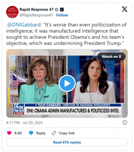 »Posledice tega so zgodovinske,« je Gabbard povedala za Fox News’ Sunday Morning Futures. »To je hujše od politizacije obveščne skupnosti. To so bili izmišljeni obveščni dokumenti, namenjeni doseganju cilja predsednika Obame in njegove ekipe, ki je bil spodkopati predsedovanje predsednika Trumpa in spodkopati voljo ameriškega ljudstva.«