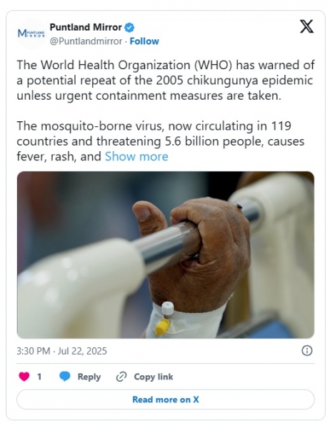 Svetovna zdravstvena organizacija (WHO) je opozorila na morebitno ponovitev epidemije čikungunje iz leta 2005, razen če se sprejmejo nujni ukrepi za zajezitev.