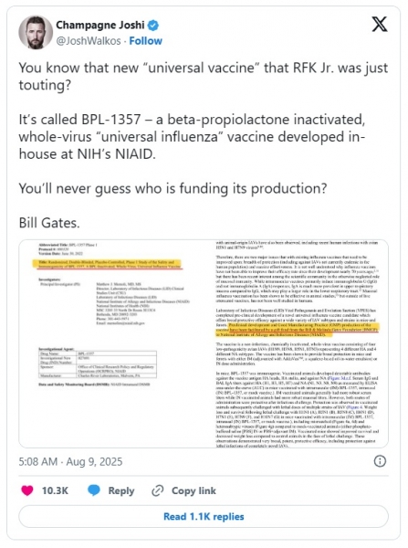 Kennedy, dolgoletni kritik cepiv in Billa Gatesa, zdaj promovira "univerzalno cepivo" BPL-1357 – projekt, ki ga je, kot kaže, financirala fundacija Billa in Melinde Gates. Če to ni dokaz hinavščine, potem ne vem, kaj je ...