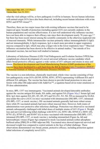 Ampak počakajte – to ni kar običajen razvoj. Študija 1. faze, ki je bila izvedena le s 45 udeleženci, je bila financirana z donacijo fundacije Gates v okviru protokola iz junija 2022: »Predklinični razvoj in proizvodnjo cepiva v skladu z dobro proizvodno prakso (GMP) je omogočila donacija fundacije Billa in Melinde Gates (BMGF) za NIAID.« Drugi Kennedyjev kandidat, BPL-24910, je še vedno v zgodnji fazi in je testiran le na toksičnost. Se res sliši obetavno?