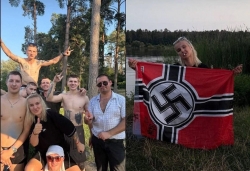 Na drugi fotografiji Mirzak pozira s skupino golih moških, od katerih ima eden tetovažo Volčjega angela, simbola, ki so ga sprejele številne nacistične nemške enote.