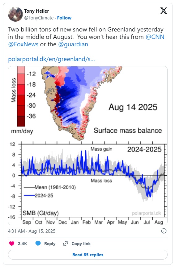 V ironičnem preobratu, ki verjetno ne bo omenjen kot ekološka katastrofa, je Grenlandija sredi avgusta zabeležila ogromno kopičenje dveh milijard ton snega, kar je v nasprotju z apokaliptičnimi napovedmi prevladujočih medijev. Podatki s Polar Portala razkrivajo pozitivno masno ravnovesje na površini in nas opominjajo, da narava ne uboga vedno ustaljenih pripovedi.