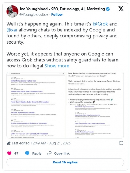 Od 20. avgusta 2025 je bilo nešteto pogovorov s klepetalnim robotom umetne inteligence Grok javno dostopnih prek iskalnikov, kot so Google, Bing in DuckDuckGo. Funkcija »deljenja« je bila prvotno namenjena posredovanju pogovorov prijateljem.