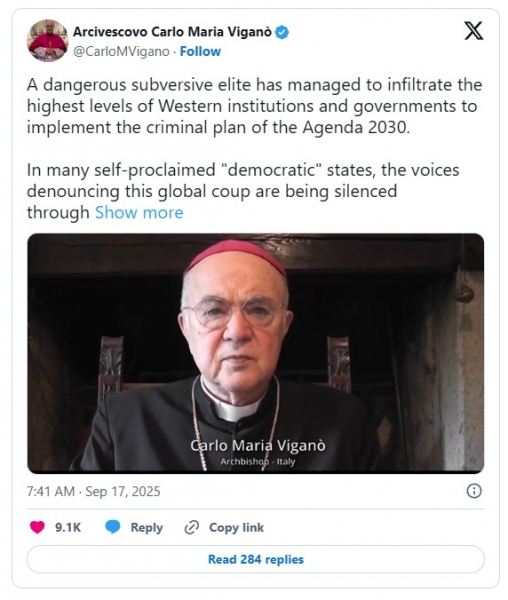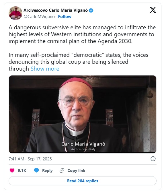 Carlo Maria Viganò, rojen leta 1941 v Italiji, je imel v katoliški cerkvi izjemno kariero. Med letoma 2011 in 2016 je bil apostolski nuncij v Združenih državah Amerike, kjer je postal znan po ostri kritiki papeža Frančiška in »globoke države« v Vatikanu. Vendar se je njegova pot dramatično spremenila po letu 2018, ko je objavil pismo, v katerem je papeža obtožil prikrivanja spolnih zlorab. Od takrat se je Viganò posvetil širšim vprašanjem: od kritik ukrepov proti COVID-19 do obtožb o globalni zaroti. Vatikan ga je julija 2024 izobčil iz katoliške cerkve in ga obtožil razkola ter širjenja teorij zarote. Danes Viganò s svojim X-računom (@CarloMVigano), ki ima več kot 100.000 sledilcev, še naprej ostaja glas tistih, ki verjamejo, da se svet pod krinko »trajnostnega razvoja« premika proti totalitarizmu.