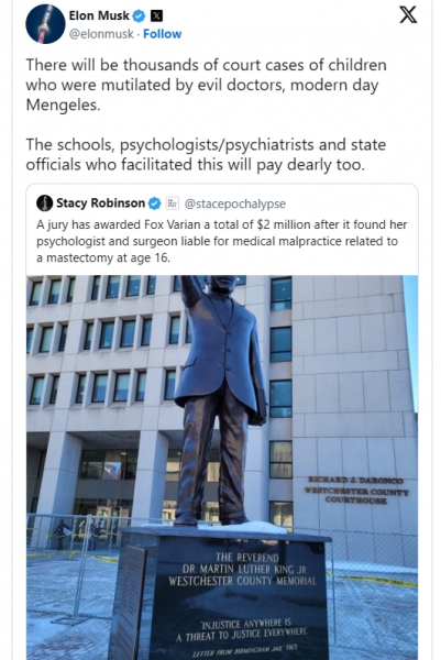 Elon Musk meni, da se bodo ameriški kirurgi, ki so v ZDA izvajali postopke »spremembe spola« pri mladoletnikih, kmalu soočili s tisoči tožb.