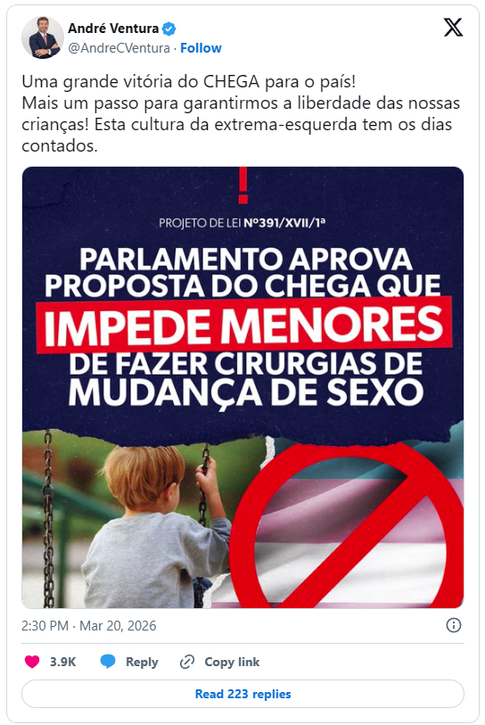 To pomeni, da biološka resničnost in medicinsko strokovno znanje ponovno štejeta več kot kakršna koli zaznana resnica. André Ventura, vodja stranke Chega, je to odlično povzel in proslavil konec tega »radikalnega ideološkega eksperimenta«, ki so ga levičarske in prebujene sile leta vsilje portugalskemu prebivalstvu.