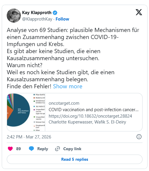 To je ultimativni adut zdravstvenih oblasti in samooklicanih preverjcev dejstev: »Ni študij, ki bi preuče vzročno zvezo med cepivom proti covidu-19 in rakom.« Zakaj pa ne, točno? Odgovor je v svoji logični briljantnosti skoraj brez primere: »Ker še ni študij, ki bi dokazovale vzročno zvezo.« Absurden krožni argument, ki služi le enemu namenu: zamižati na eno oko, prikrivati stvari in za vsako ceno ohranjati pripoved o domnevno »varnem in učinkovitem« cepljenju.