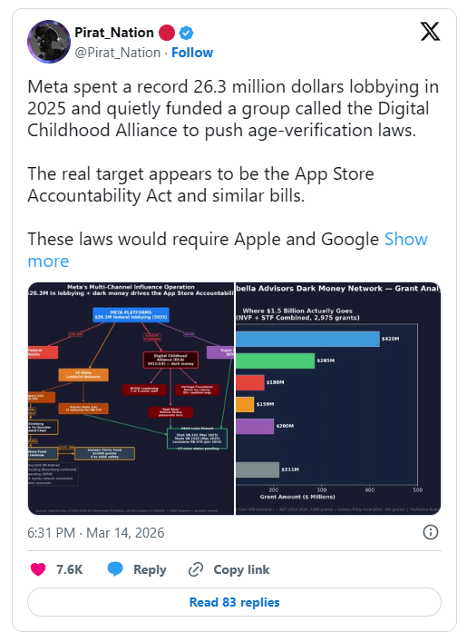 Medtem ko se politiki pretvarjajo, da kaznujejo Marka Zuckerberga, vodja Mete (Facebook, Instagram, WhatsApp) na sodišču pod prisego zahteva prav to: preverjanje starosti na ravni operacijskega sistema s strani Appla in Googla. Razlog je pravzaprav precej preprost: ker gre za velikanski, večmilijardni posel za velika tehnološka podjetja! Platforme družbenih medijev imajo ogromen problem z boti. Če bo vsak uporabnik prisiljen razkriti svojo pravo identiteto, bodo boti izginili. Prihodki od oglaševanja bodo eksplodirali, ker bo vsak klik prišel od preverjenega, transparentnega človeka.