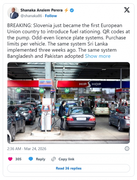 Slovenija je pravkar postala prva država Evropske unije, ki je uvedla racioniranje goriva. QR kode na bencinskih črpalkah, piše analitičarka Shanaka Perera, neodvisna analitičarka, avtorica in raziskovalka, ki analizira svetovno gospodarstvo, geopolitiko, umetno inteligenco (UI) in finančne trge.