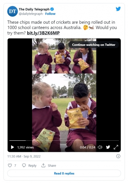 Članek v avstralskem The Daily Telegraphu, skrit za plačilnim zidom, trenutno povzroča ogorčenje brez primere na družbenih medijih. Po njegovih besedah 1000 avstralskih šol že prodaja čips za žuželke učencem, da bi popularizirali in normalizirali to zelo vprašljivo živilo, vse v korist podnebja. Še bolj moteč pa je priložen videoposnetek, ki prikazuje nekoga – domnevno novinarja –, ki skuša zelo majhne otroke prepričati, da je ta čips zanje še posebej zdrav. Študija kaže nasprotno.