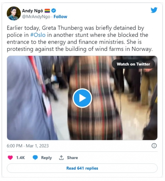 Alarmist za podnebne spremembe Greta Tunberg je bila aretirana na Norveškem v drugi premiki PR, medtem ko je protestirala proti vetrnim turbinam.