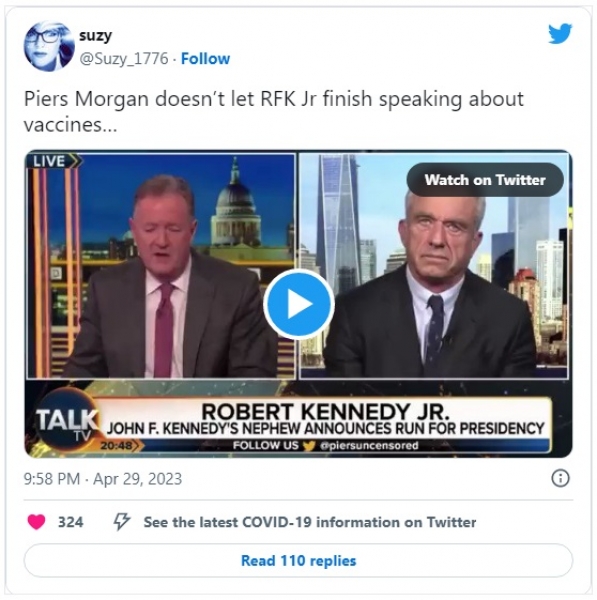 Intervju med RFK Jr. in Piersom Morganom pa je bil prekinjen, ko je Kennedy začel govoriti o nevarnostih cepiv.