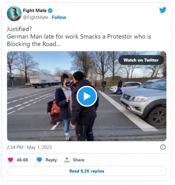 Na kratkem videu je moč videti Nemca močne postave, ki je izgubil nadzor in enega od aktivistov močno udaril po obrazu. Ni pomagalo, akcija blokade se je nadalja. Vsaj tokrat na človeka ni skočilo na desetine nasilnih državnih izvršiteljev, kot je to običajno pri drugih akcijah podnebnih plačancev. Nihče tega ne razume bolj kot delavci davkoplačcev: zakaj država ne naredi reda, ampak napada državljane, ki se hočejo samo voziti po svoje.