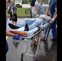 Stranski učinki | Ljudje pred cepilnim centrom nekje v Rusiji, čakajo na svoj odmerek, ko mimo njih proti rešilcu odpeljejo človeka, ki ima očitno takojšnje stranske učinke po cepivu ...